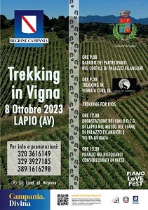Trekking e vendemmia, cultura e storia s’intrecciano nel prossimo appuntamento previsto domenica 8 ottobre a Lapio: trekking in vigna. Una giornata interamente dedicata alla natura e ai buoni sapori, un’iniziativa a cura dell’Amministrazione Comunale di Lapio e di Land_of_Hirpinia, associazione da sempre dedita alla promozione del piccolo borgo, patria del FIANO DOCG, e impegnata in attività come passeggiate nella natura e trekking.