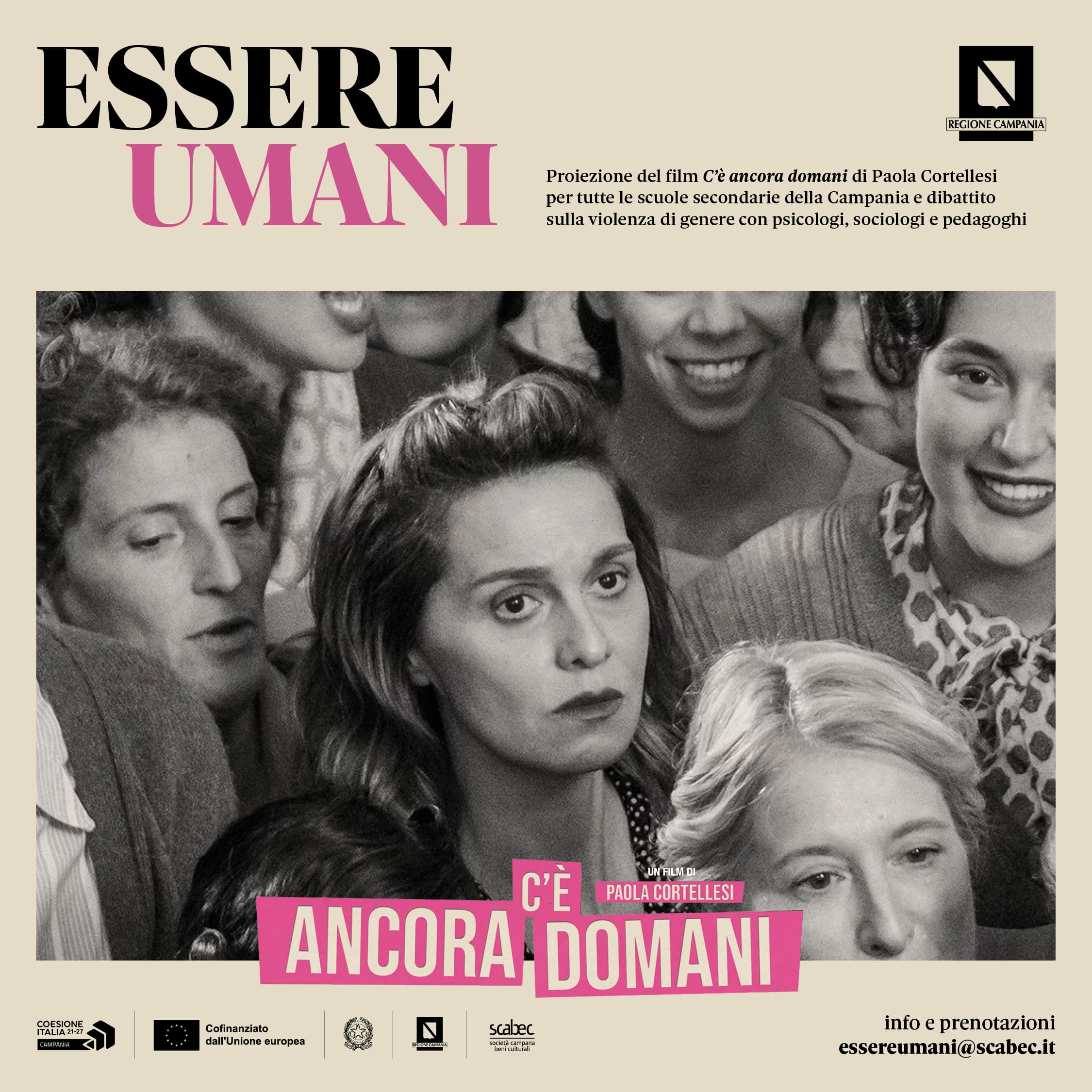 Dopo i primi appuntamenti nei cinema di Napoli lo scorso mese di dicembre, il progetto regionale – che vede la compartecipazione dell’Assessorato alla Scuola, Politiche Sociali, Politiche Giovanili,della Direzione Generale per le Politiche Sociali e Socio-Sanitarie e della Direzione Generale per le Politiche Culturali e il Turismo, attuato dalla Scabec (Fondi PR Campania FSE+ 2021-2027) – ripartirà lunedì 22 gennaio coinvolgendo migliaia di studenti nella proiezione del film C’è ancora domani di Paola Cortellesi, seguita da un dibattito a cui prenderanno parte psicologi esperti sulla tematica: un ciclo di circa 600 proiezioni del film, riservate agli alunni delle scuole secondarie di primo e secondo grado, in oltre 30 cinema in tutta la Campania.