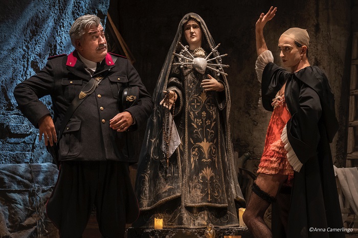 Primavera del 1943, Napoli. Una tarda mattinata di sole viene squarciata dalle sirene: arrivano gli aerei alleati e il pericolo di un nuovo e devastante bombardamento. La scena è uno scantinato che fa da rifugio improvvisato. In un angolo del locale una Statua della Madonna Immacolata, miracolosa-mente scampata alla distruzione di una chiesa. È qui che si ritrova una strana compagnia, riunita dalla necessità di riparo: Bambinella, un femminiello che sopravvive esercitando la prostituzione e che conosce tutto di tutti, e il Brigadiere Raffaele Maione, che ha appena arrestato Melina, una ventenne che ha appena sgozzato nel sonno il Marchese di Roccafusca, di cui la ragazza era la cameriera. Mentre fuori la porta le voci della gente si trasformano in un pauroso silenzio e poi nel progressivo avvicinarsi del fragore delle bombe, il dialogo tra i tre occupanti del rifugio si fa sempre più profondo e serrato, con una serie di riflessioni sulla vita, la morte, la giustizia, la fede, ma anche la fame e l’arroganza del potere. Mentre apprendiamo cosa sia realmente accaduto nel palazzo di Roccafusca e perché, Bambinella si trasformerà in un avvocato difensore e Maione nell’accusa di un processo che vedrà nella statua di gesso un giudice silenzioso ma accorato.